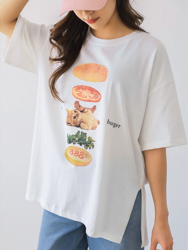 【C56007】韓國PSS 貓貓漢堡T恤-貓咪印花寬鬆長版側開衩七分袖上衣★★