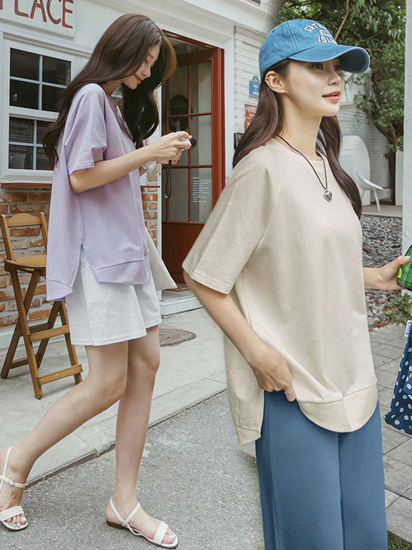 【C56025】韓國MID 長版五分袖上衣-寬鬆弧形下襬側開衩好氣色素面★★
