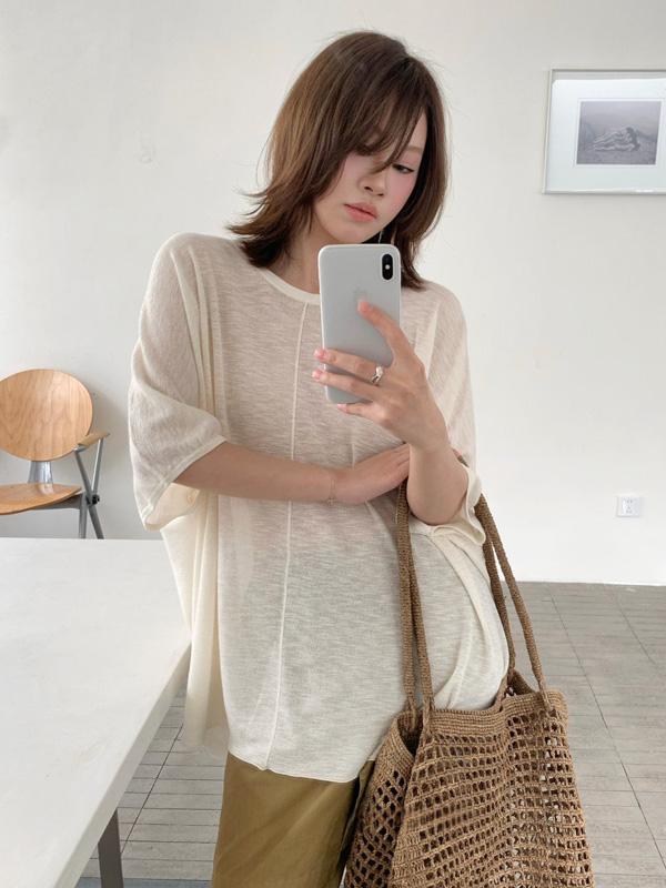 【C54832】韓國IAN 船領長版針織-寬鬆素面飛鼠短袖開衩上衣透氣_影片★★