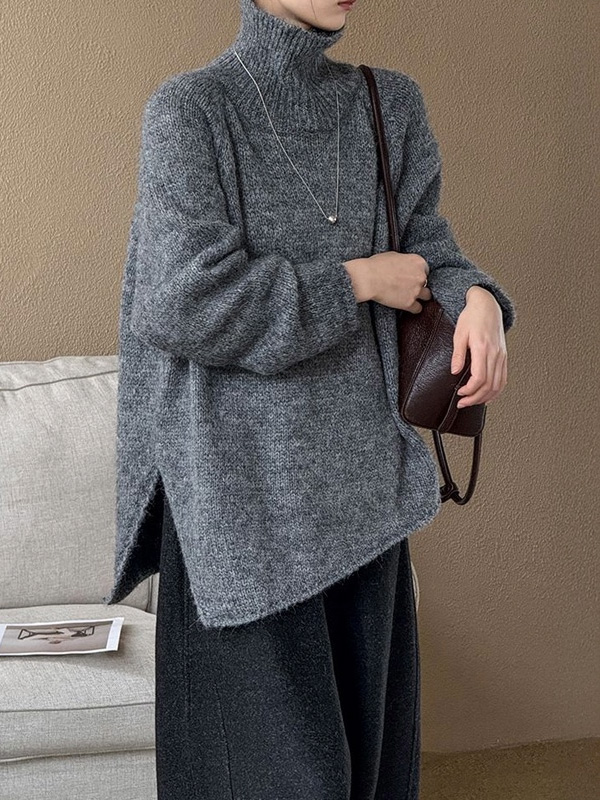 【C60073】品牌 不對稱高領毛衣-素面反摺立領寬鬆長袖側開衩上衣