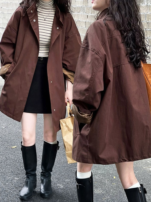 【C60145】品牌 長版立領風衣-素面隱形排釦雙口袋寬鬆長袖外套
