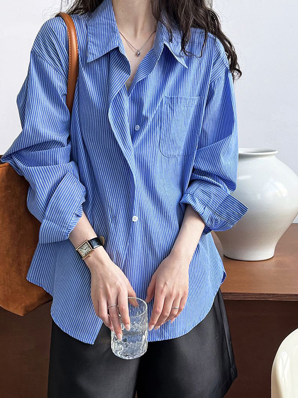 【C60149】品牌 細直條紋襯衫-寬鬆長版弧形下襬口袋長袖上衣★★
