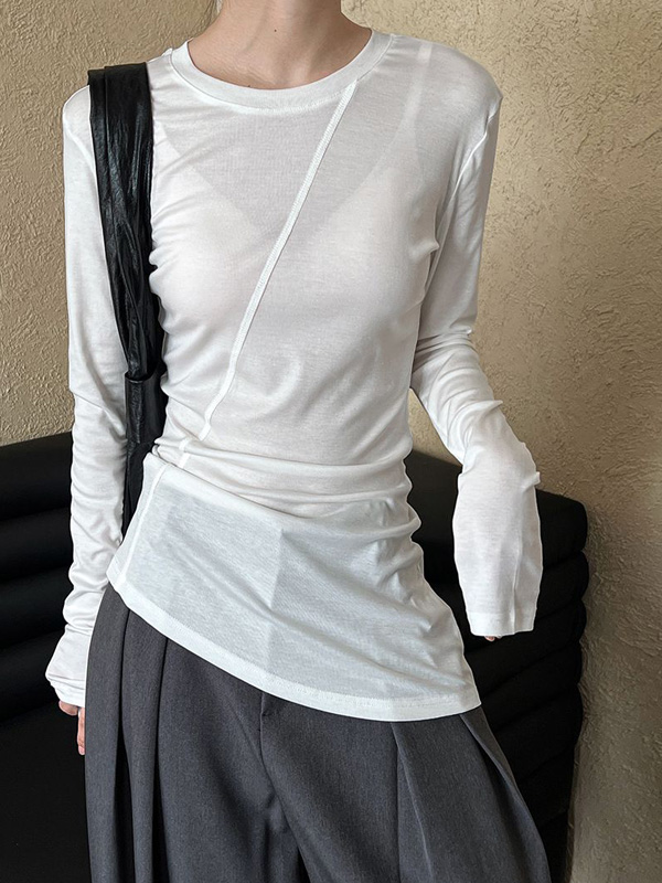 【C60150】品牌 斜邊車線素T-素面圓領輕薄貼身長版長袖上衣
