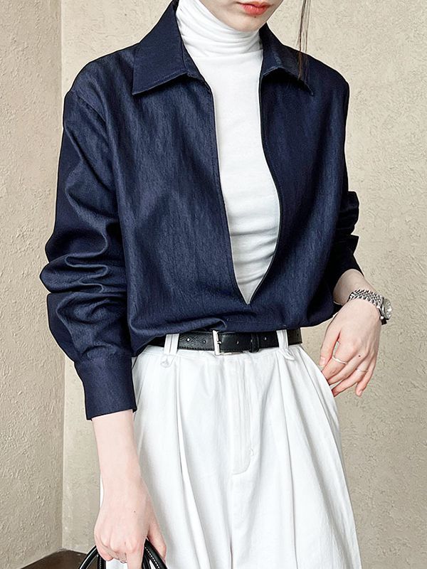 【C60152】品牌 開衩深V領襯衫-素面寬鬆長版長袖牛仔上衣