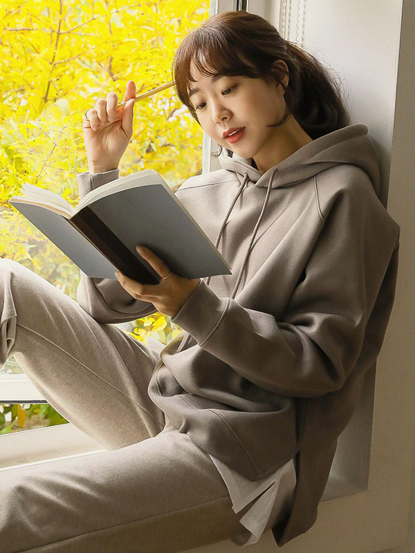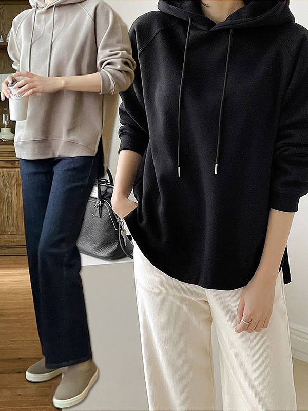 【C55726】韓國PUR 內刷毛帽T-寬鬆長版連肩袖素面抽繩連帽長袖上衣