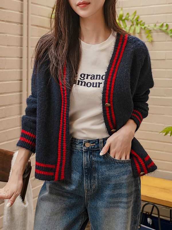 【C55714】韓國CAN 針織金釦外套-混羊毛V領跳色滾邊素面排釦長袖