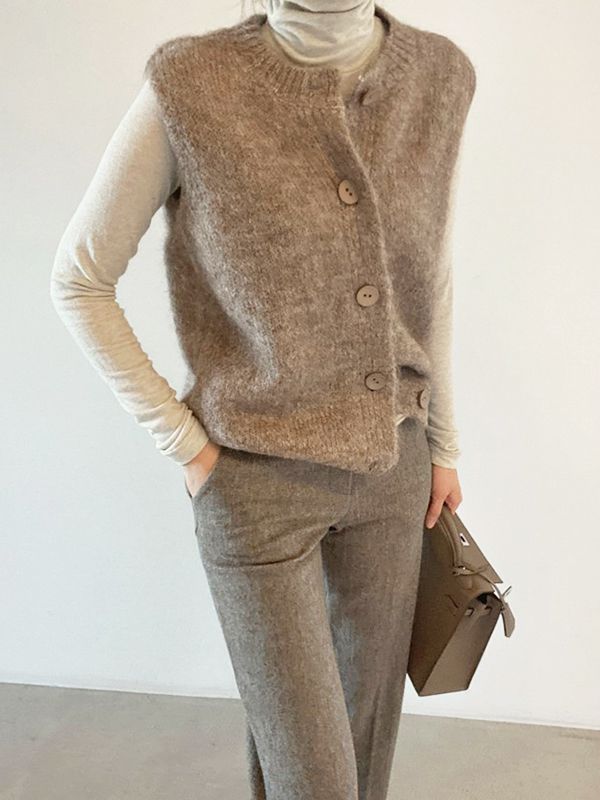 【C55715】韓國GRC 毛絨針織背心-寬肩開襟排釦混羊毛無袖素面外套