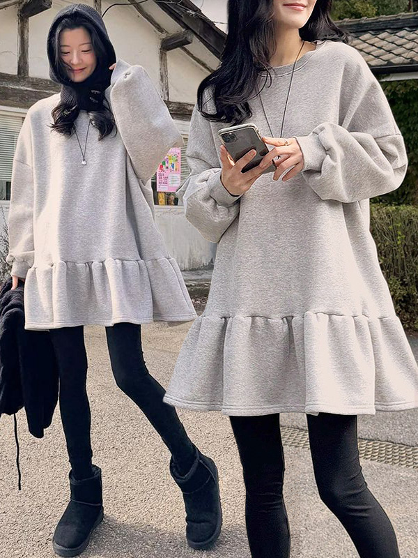 【C55724】韓國LOL 花邊裙襬短洋裝-內刷毛寬鬆後背字母標長袖連身裙