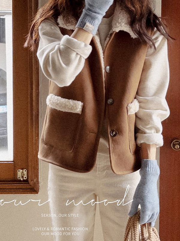 【C55727】韓國LEE 雙面穿毛毛背心-麂皮羔羊毛素面翻領口袋無袖外套