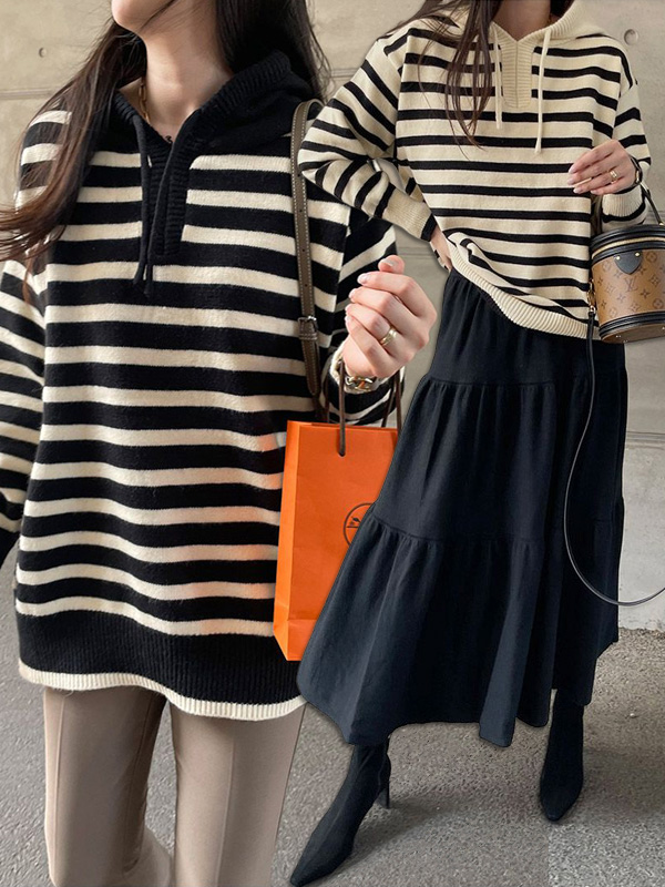 【C55728】韓國MNR 條紋針織衫-抽繩連帽Y字領厚實面料長袖上衣