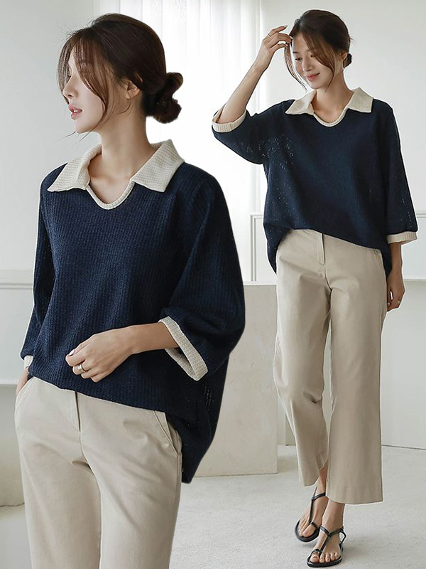 【C55734】韓國BLG 鬆餅格針織上衣-寬袖拼色V領寬鬆長版七分袖上衣