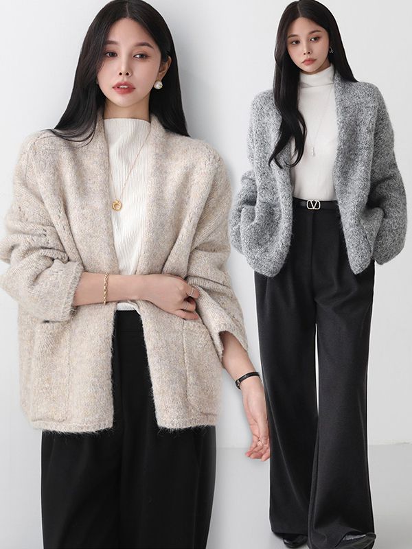 【C55741】韓國PPI 針織無釦外套-開襟鏤空編織寬鬆混羊毛素面長袖