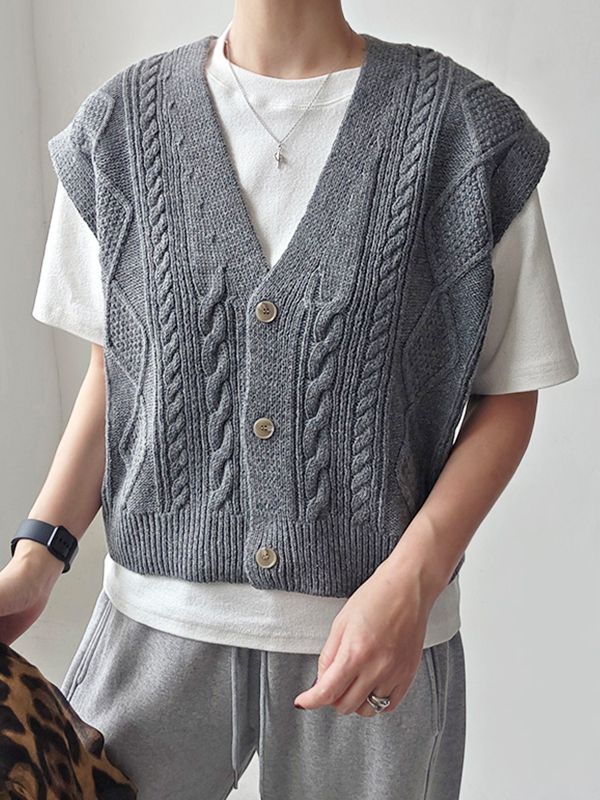 【C55744】韓國WTM 麻花針織外套-短版素面深V領混羊毛排釦無袖背心