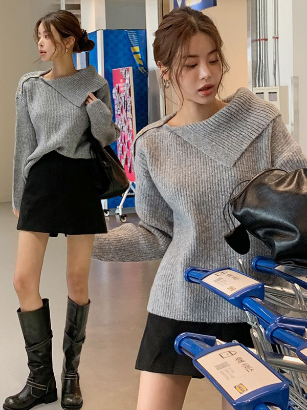 【C55746】韓國TMO 斜邊翻領針織衫-不對稱大領片素面排釦肩長袖上衣