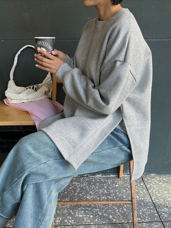 【C55680】韓國DLY 內刷毛大學T-好氣色素面寬鬆長版側開衩長袖上衣★★