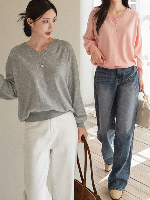 【C55546】韓國CAN 素面OL針織衫-上寬下窄V領親膚落肩長袖上衣★★