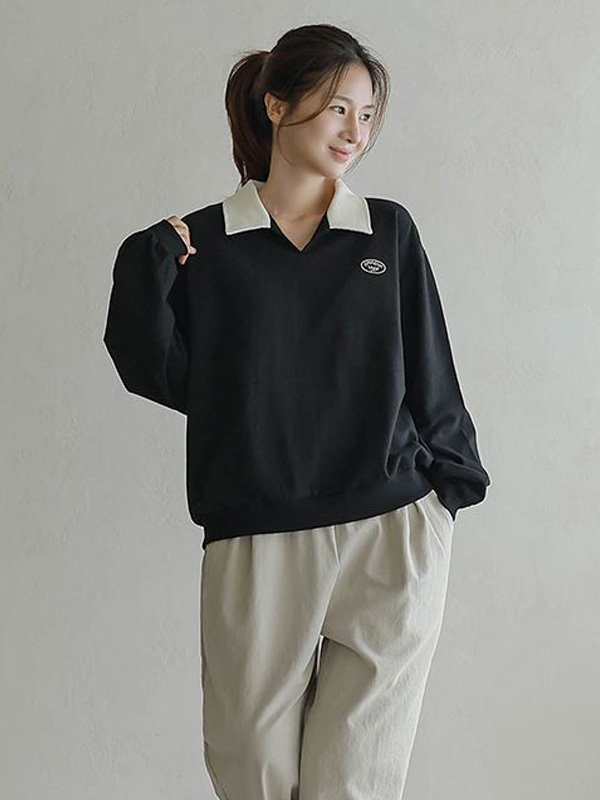 【C55585】韓國BLG 跳色翻領上衣-寬鬆大尺碼V領字母貼布長袖T恤