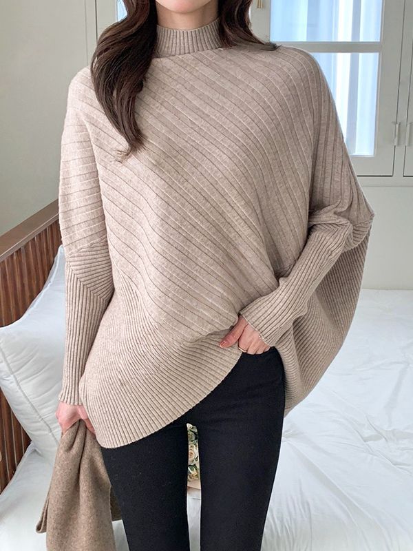 【C55837】韓國MRN 不對稱針織衫-高領斜紋壓印飛鼠袖素面長袖上衣★★
