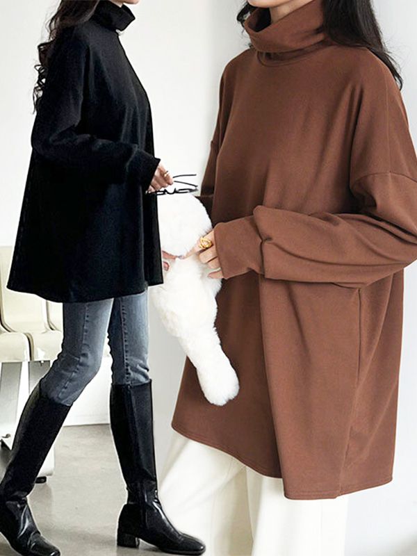 【C55882】韓國HAN 蜜桃絨高領上衣-寬鬆長版素面立領長袖T恤★★