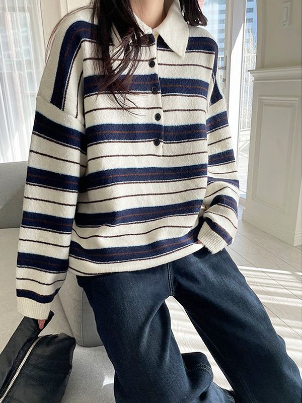 【C55883】韓國MNR 三色條紋針織衫-半開襟排釦領寬鬆長版長袖上衣★★