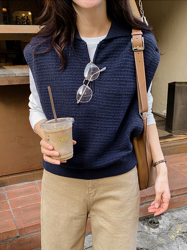 【C55888】韓國JAM 拉鍊領針織背心-素面半開襟領側開衩包肩無袖上衣