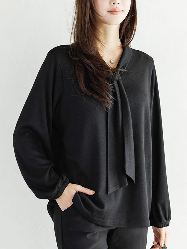 【C55918】韓國DED 領巾素面上衣-OL絲巾感V領寬鬆長版長袖上衣