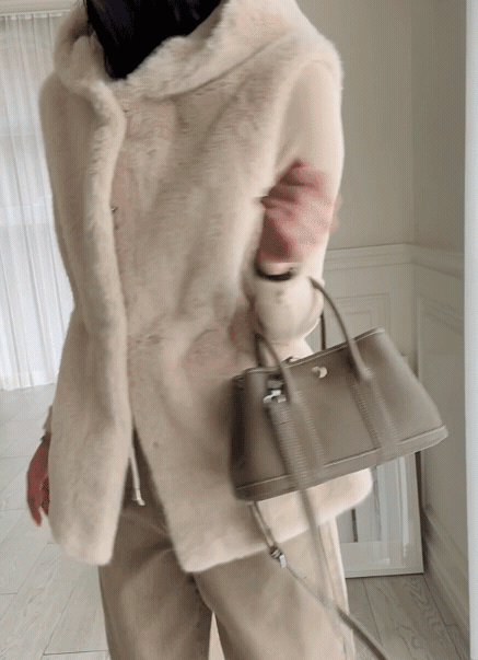 碎鑽鈕釦/隱形勾釦/內抽繩收腰/外毛毛內麂皮/雙口袋/連帽外套 - 休閒居家婚禮簡約百搭素面連帽毛毛背心外套無袖背心外套米色黑色棕色深灰色白色
