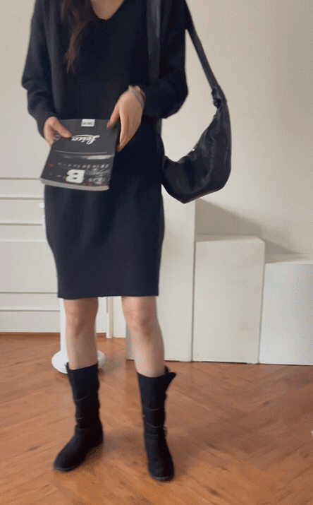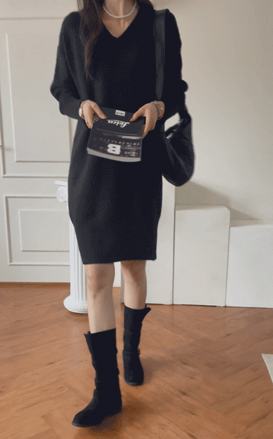 【C55718】韓國MNR 針織彈性連身裙-寬鬆素面深V領落肩長袖洋裝★★