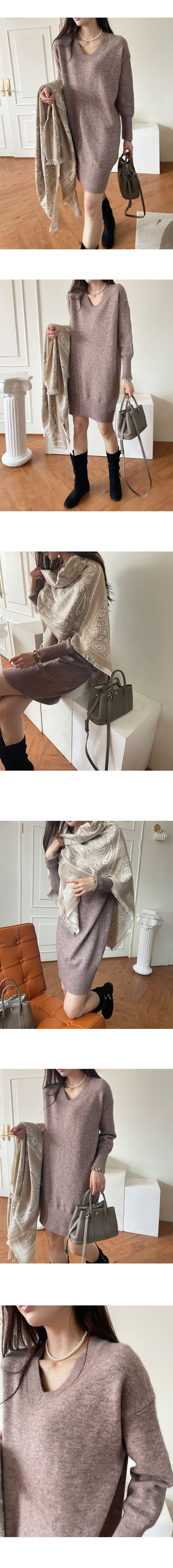 無身形限制安心穿搭/超彈針織包容性強/V領修飾小臉蛋-休閒居家簡約百搭針織彈性寬鬆素面深V領落肩長袖洋裝連身裙深藍色棕色米色黑色