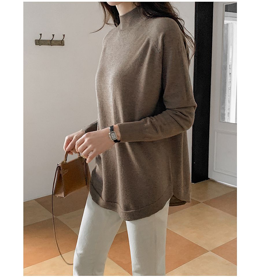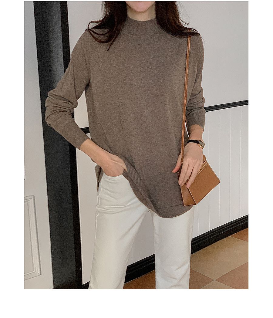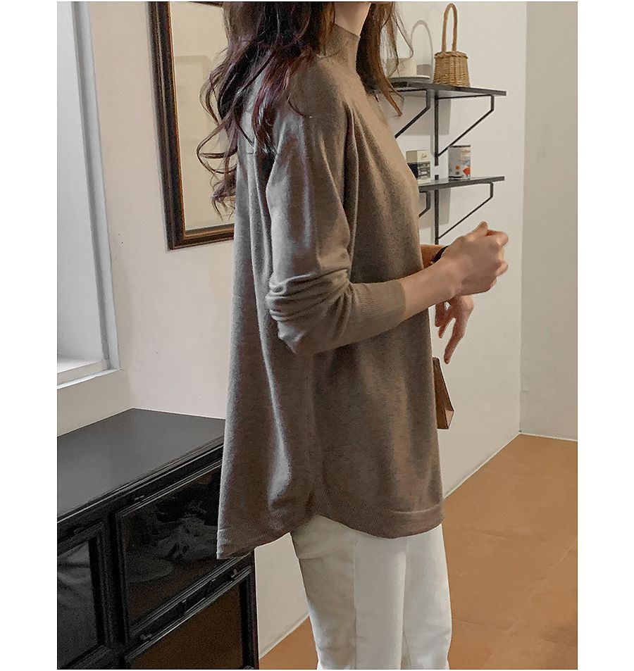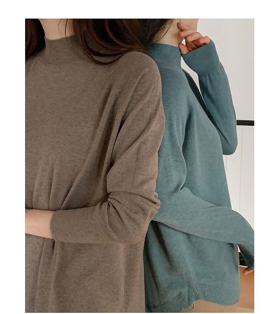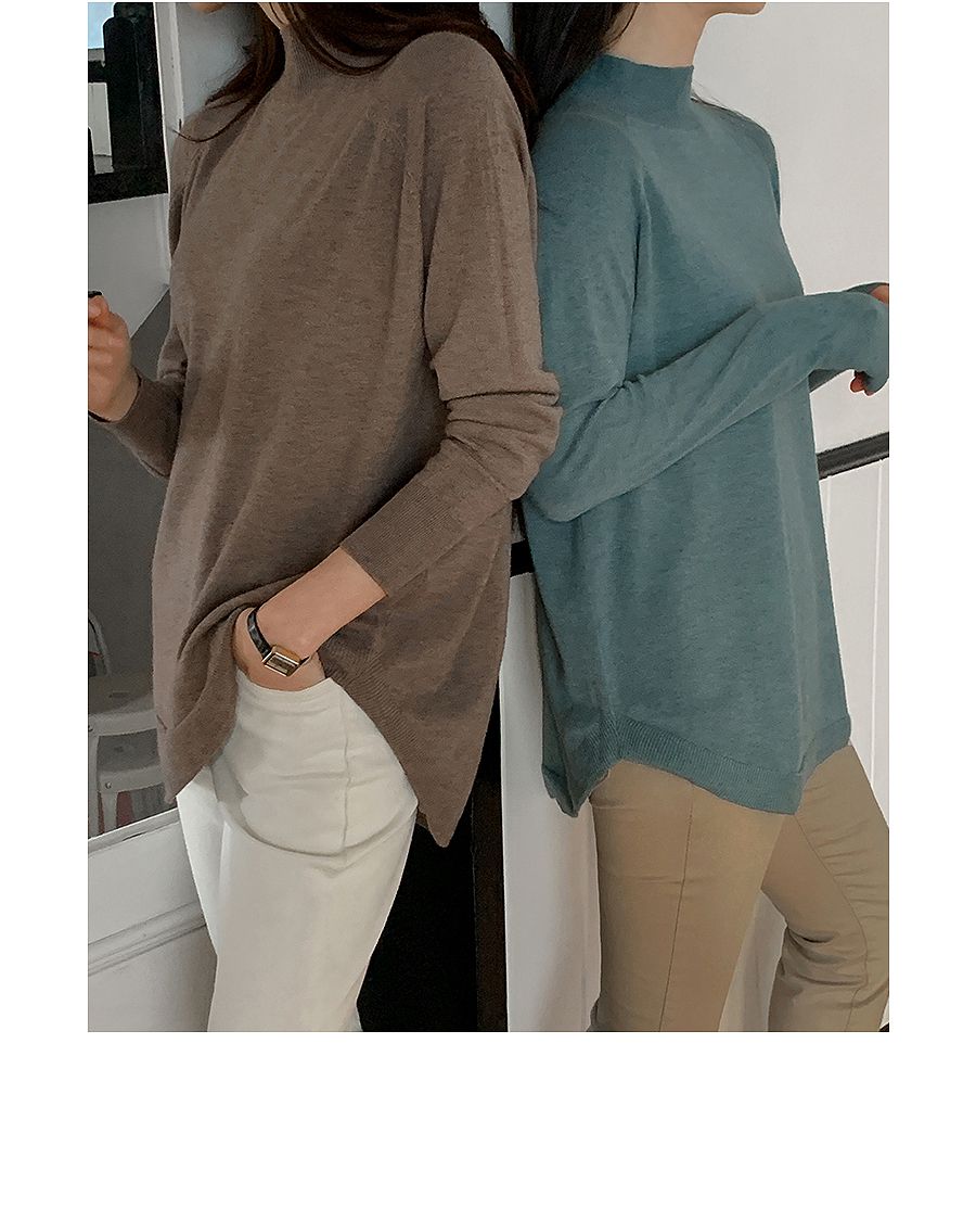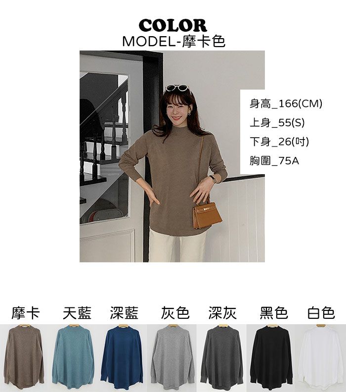 輕薄柔軟針織/弧形下襬/側開衩/高領/立領/連肩袖 - 休閒居家簡約百搭素面立領針織上衣長版上衣針織衫模卡色天藍色深藍色灰色深灰色黑色