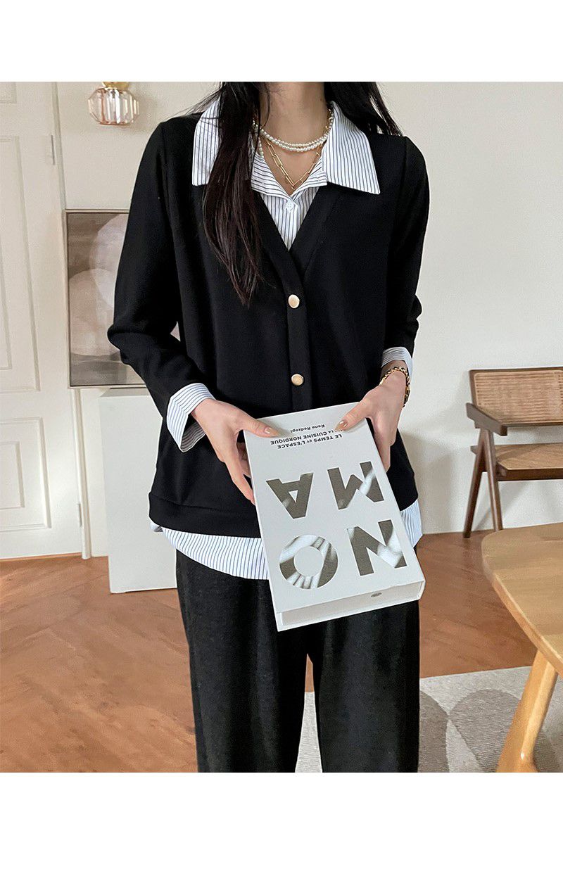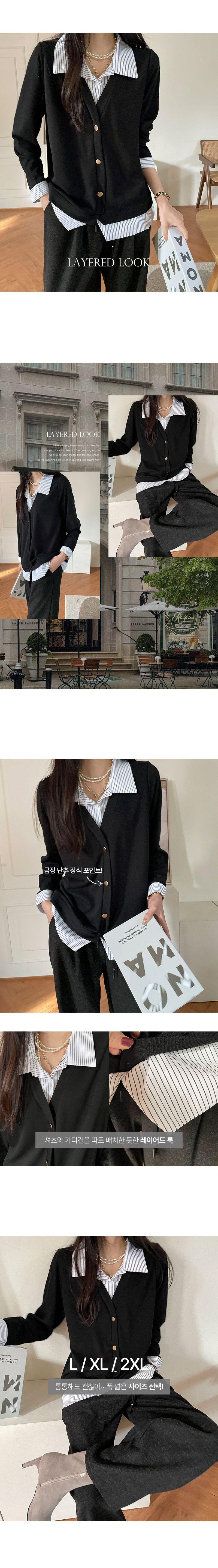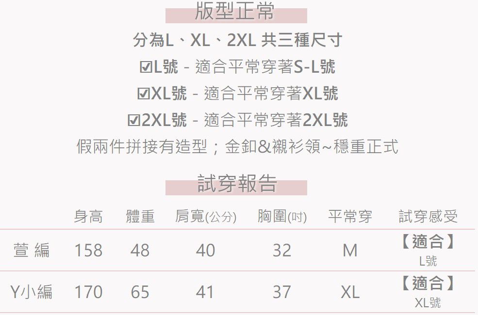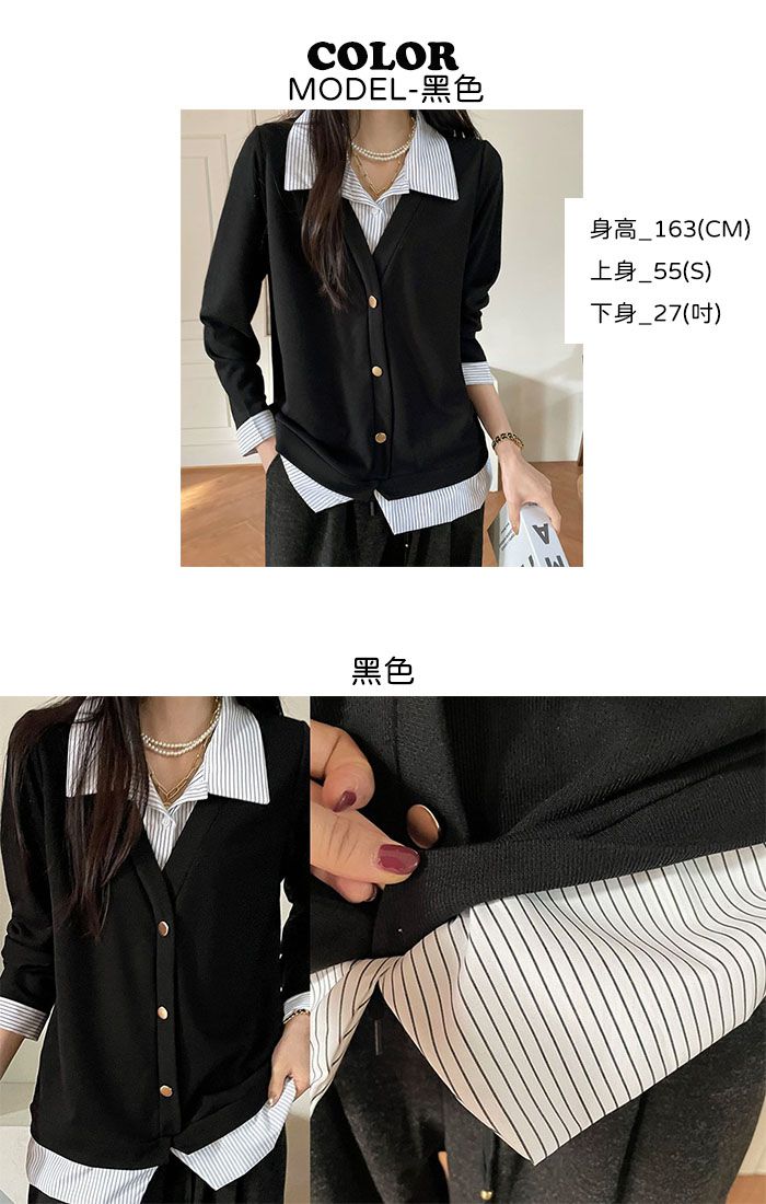 三種尺寸/假兩件拼接/條紋襯衫領/V領/金色鈕釦/假排釦造型(不可開)/寬鬆長版 - 休閒OL上班族條紋上衣條紋襯衫襯衫拼接上衣寬鬆大尺碼上衣長版上衣長袖上衣多尺寸LXL2XL黑色