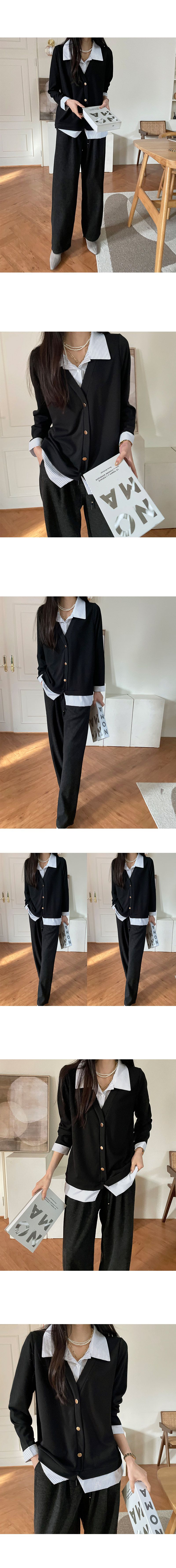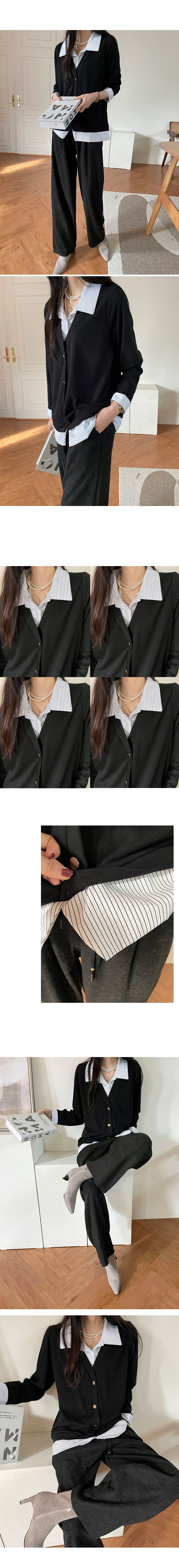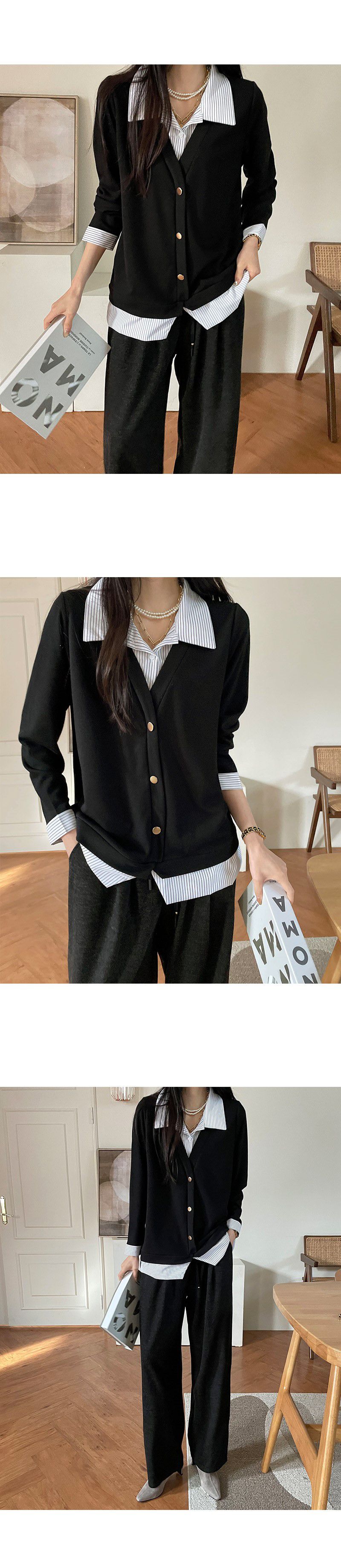三種尺寸/假兩件拼接/條紋襯衫領/V領/金色鈕釦/假排釦造型(不可開)/寬鬆長版 - 休閒OL上班族條紋上衣條紋襯衫襯衫拼接上衣寬鬆大尺碼上衣長版上衣長袖上衣多尺寸LXL2XL黑色