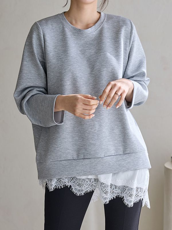 【C55954】韓國BLG 蕾絲下襬上衣-素面假兩件拼接斜邊寬鬆長版長袖★★