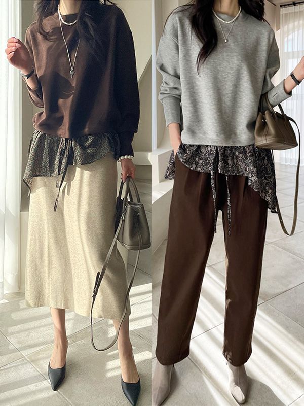 【C55959】韓國MNR 碎花下襬上衣-假兩件拼接不對稱長版收腰長袖上衣★★