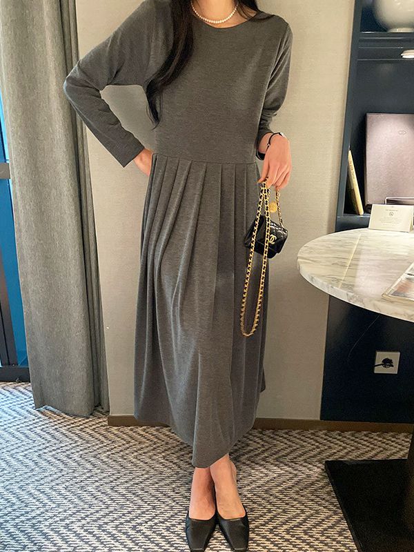 【C55961】韓國MNR 寬鬆百褶裙洋裝-素面圓領柔軟親膚長袖連身裙★★