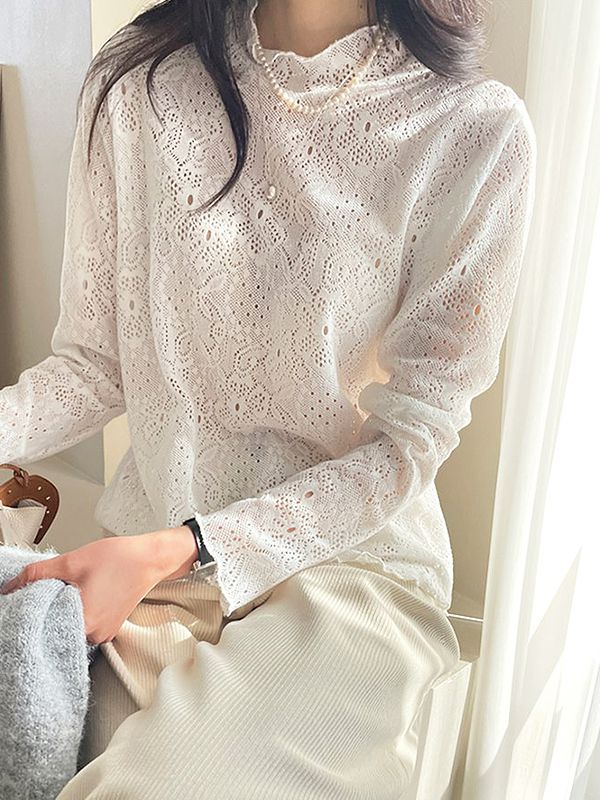 【C55964】韓國MNR 透膚蕾絲上衣-花邊立領縷空雕花素面長袖上衣★★