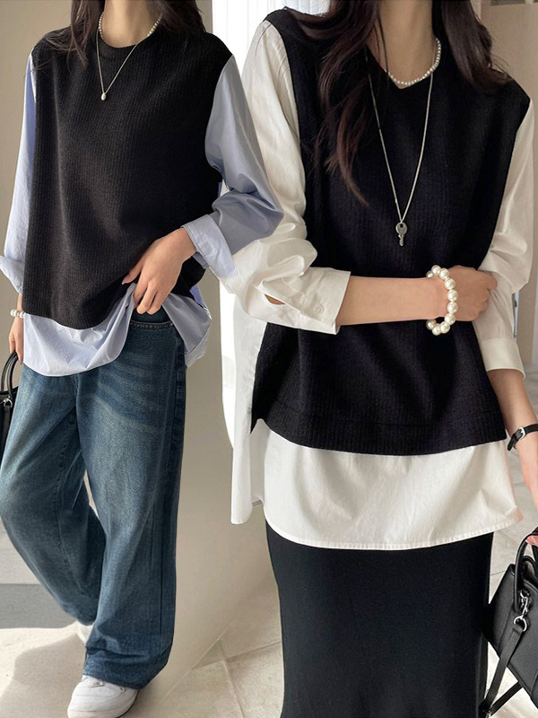 【C55965】韓國MNR 假兩件長版上衣-針織背心拼接襯衫寬鬆圓領長袖★★
