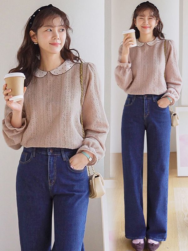 【C55970】韓國LEE 毛絨蕾絲襯衫-點點圓領透膚雕花公主長袖上衣★★