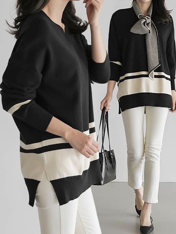 【C55973】韓國MAZ 長版條紋上衣-寬鬆V領側開衩色塊長袖針織衫★★