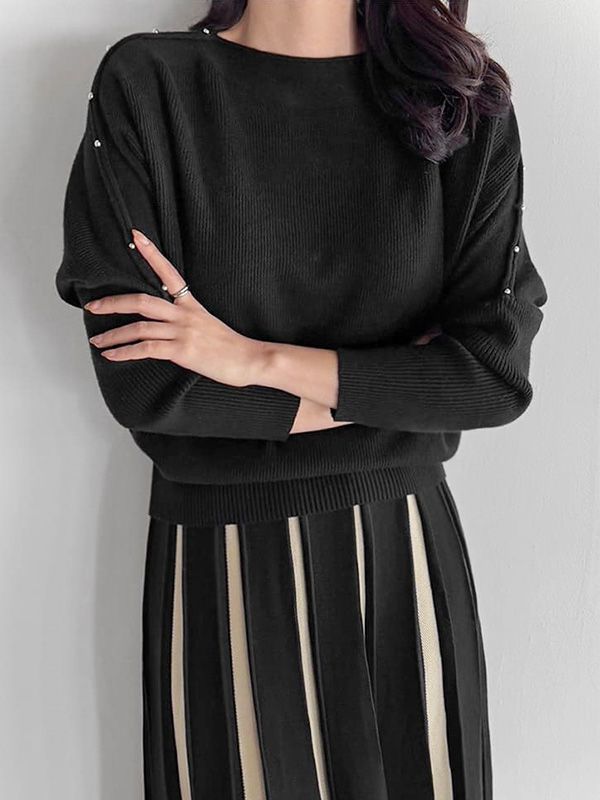 【C55974】韓國MAZ 鉚釘拼袖針織衫-一字領飛鼠袖素面捲邊長袖上衣★★
