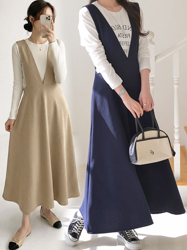 【C55975】韓國DLY 深V領背心洋裝-抗皺素面外搭無袖傘狀連身裙★★