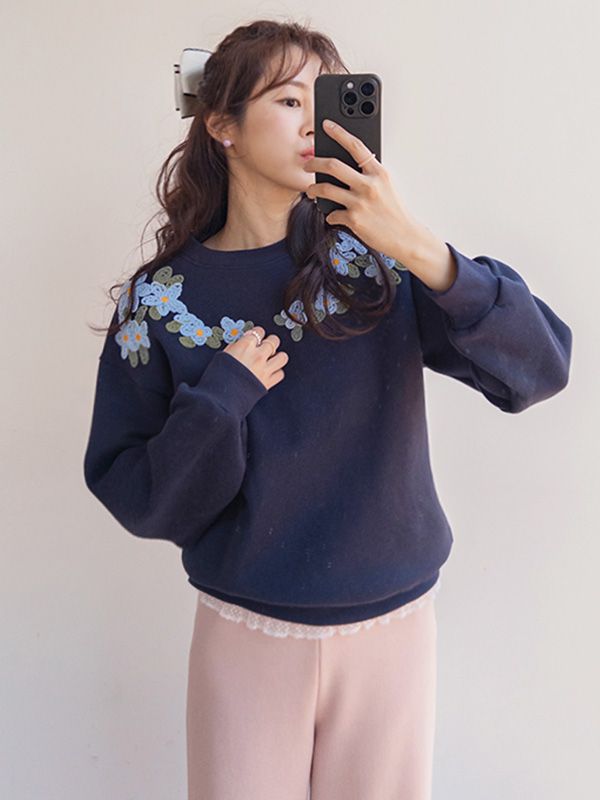 【C55976】韓國LEE 毛線花花大學T-立體刺繡印花內刷毛圓領長袖上衣