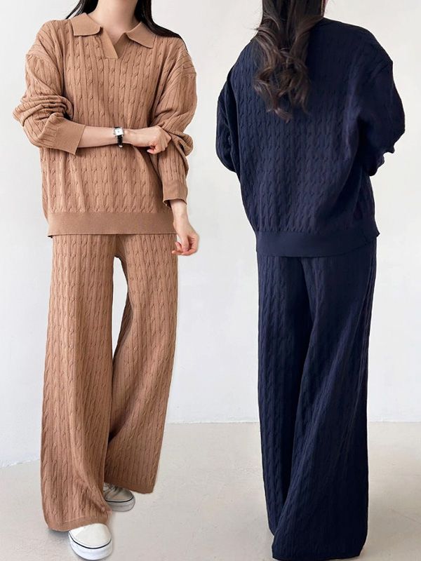 ★限時24H優惠★【C55979】韓國OHM 麻花針織套裝-素面翻領長袖上衣+抽繩腰直筒長褲