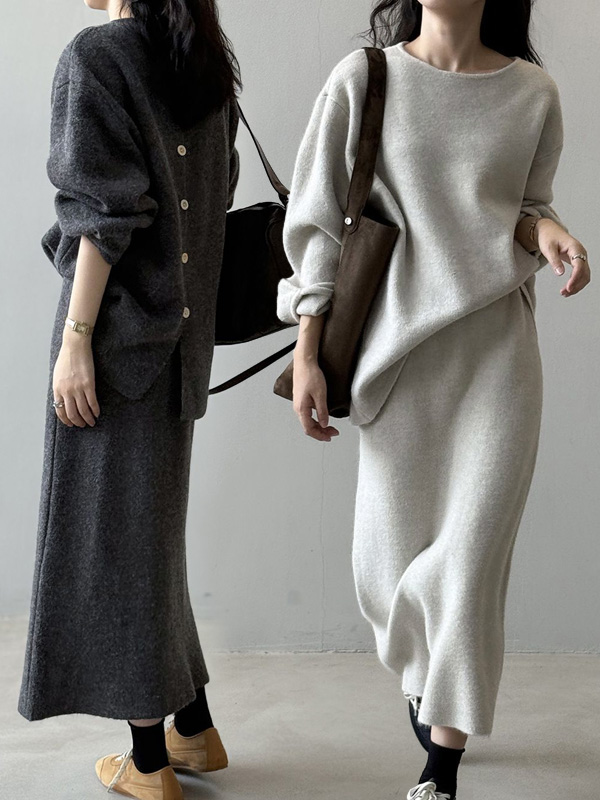 【C60004】品牌 燈籠袖針織套裝-圓領長版長袖上衣+素面直筒裙★★