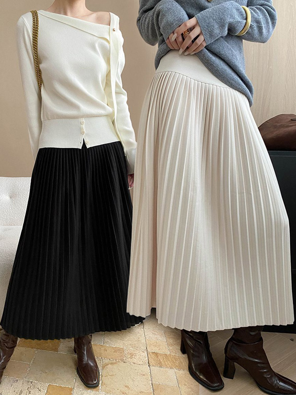 【C60111】品牌 絨布百褶裙-素面加寬褲頭側拉鍊A字傘狀長裙★★