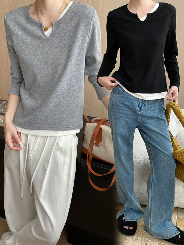 【C60127】品牌 斜邊領針織衫-素面假兩件拼接切口領合身長袖上衣★★