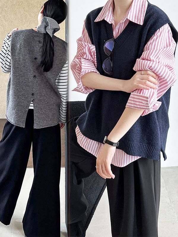 【C60155】品牌 後開衩針織背心-素面深V領後背排釦造型無袖上衣★★